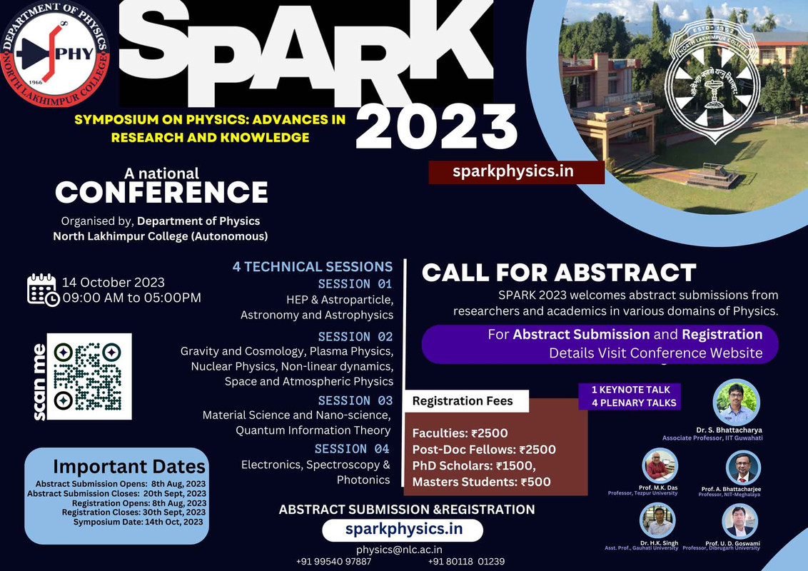 The department of Physics, North Lakhimpur College (Autonomous) extends heartfelt invitation for the inaugural national conference, SPARK 2023 (Symposium on Physics: Advances in Research and Knowledge), set to take place on October 14, 2023. The conference aims to provide a unique platform for researchers, scholars, students, and professionals to converge, exchange ideas, and delve into the latest advancements in the realm of physics. Deliberations from both theoretical and experimental fronts are expected to cover a variety of topics in physics as listed in the conference poster. The proceedings of the conference will be published in the form of special editions of Research Journal/Book.